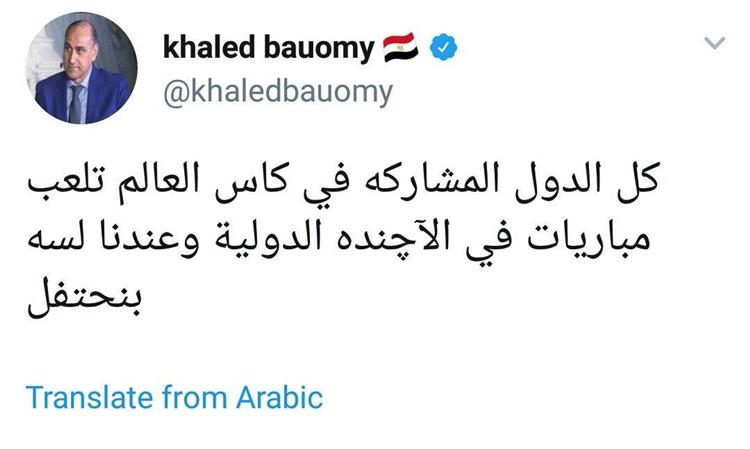 وقال بيومي، على حسابه الرسمي بموقع التواصل الاجتماعي "تويتر": "كل الدول المشاركة في كأس العالم، تلعب مباريات في الأجندة الدولية، وعندنا لسه بنحتفل".