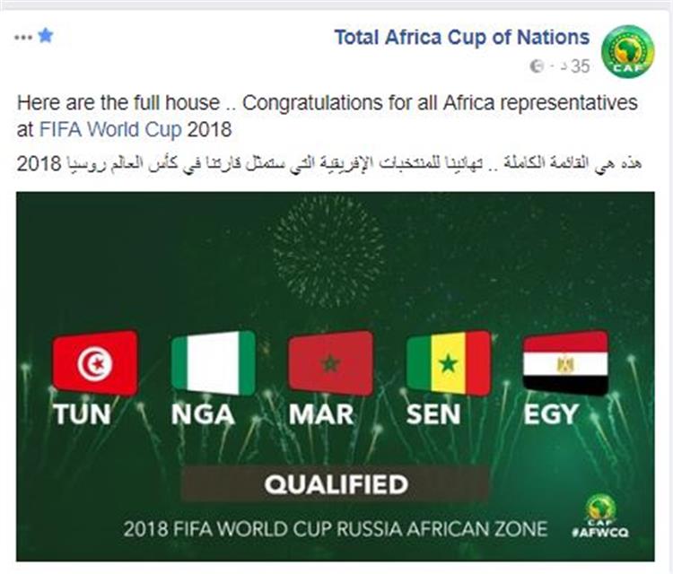 ونشر الكاف، على حسابه الخاص عبر موقع التواصل الاجتماعي "فيس بوك": "هذه هي القائمة الكاملة، تهانينا للمنتخبات الإفريقية التي ستمثل قارتنا في كأس العالم روسيا 2018".