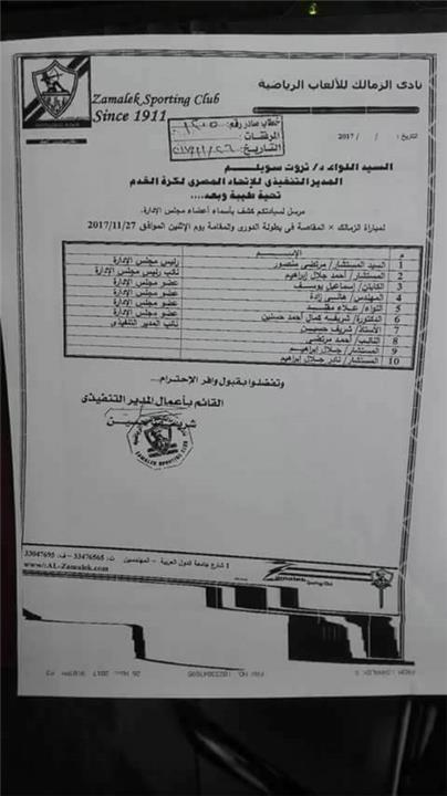 أرسل مجلس إدارة نادي الزمالك برئاسة مرتضى منصور، كشفًا بأسماء الحاضرين من المجلس، مباراة الفريق الأبيض أمام مصر للمقاصة، المقرر إقامتها مساء اليوم، الإثنين.