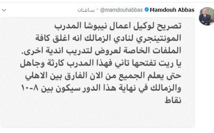 وصرح عباس عبر حسابه الشخصي على موقع التواصل الاجتماعي "تويتر": "تصريح لوكيل أعمال نيبوشا المدرب المونتيجيري لنادي الزمالك أنه أغلق كافة الملفات الخاصة لعروض تدريب أندية أخرى.. ياريت تفتحها تاني فهذا المدرب كارثة وجاهل وحتى يعلم الجميع من الآن الفارق بين الأهلي والزمالك في نهاية هذا الدور سيكون من 8 إلى 10 نقاط ".