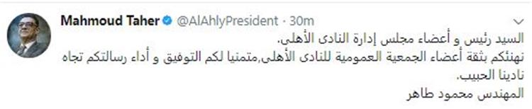 وقال طاهر خلال حسابه الخاص على موقع التواصل الاجتماعي "تويتر": "السيد رئيس وأعضاء مجلس إدارة النادي الأهلي، نهنئكم بثقة أعضاء الجمعية العمومية للمارد الأحمر".