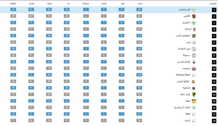 ويتصدر الإسماعيلي ترتيب الدوري، بالرغم من التعادل الإيجابي مع الجيش، برصيد 31 نقطة.