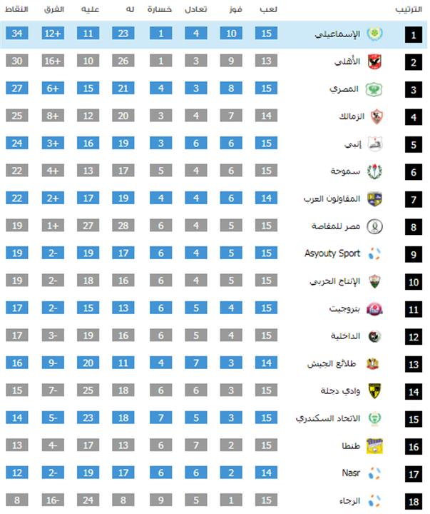 ويتصدر الإسماعيلي ترتيب جدول الدوري الممتاز، برصيد 34 نقطة، من 15 مباراة.
