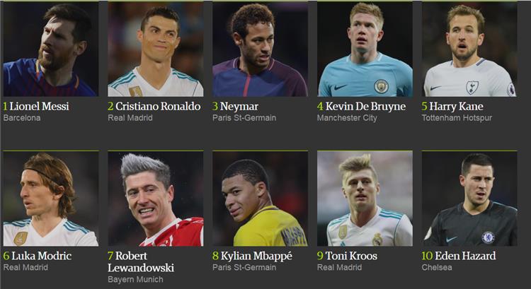 بينما تواجد لاعب بايرن ميونيخ "روبرت ليفاندوفسكي" في المركز السابع، ثم لاعب باريس سان جيرمان "كيليان مبابي" في المركز الثامن، ولاعب ريال مدريد "توني كروس" في المركز التاسع، ولاعب تشيلسي "إدين هازارد" في المركز العاشر.