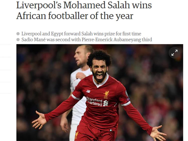 وفي صحيفة "جارديان" البريطانية تواجد المصري بعنوان "محمد صلاح لاعب ليفربول يفوز بجائزة أفضل لاعب أفريقي لعام 2017".