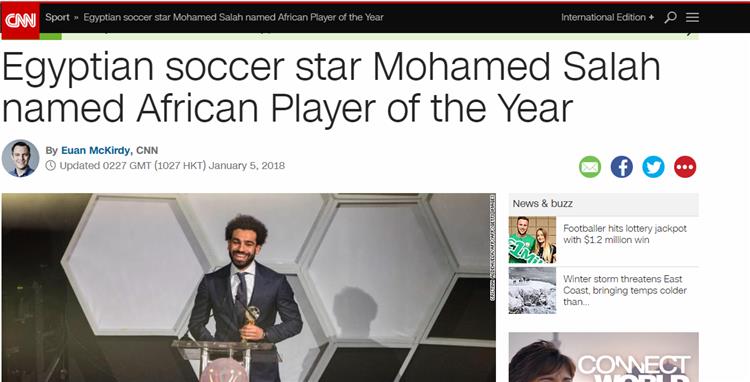 شبكة قنوات "سي.إن.إن" الأمريكية تداولت الأمر معلقة "نجم كرة القدم المصري محمد صلاح أفضل لاعب أفريقي".