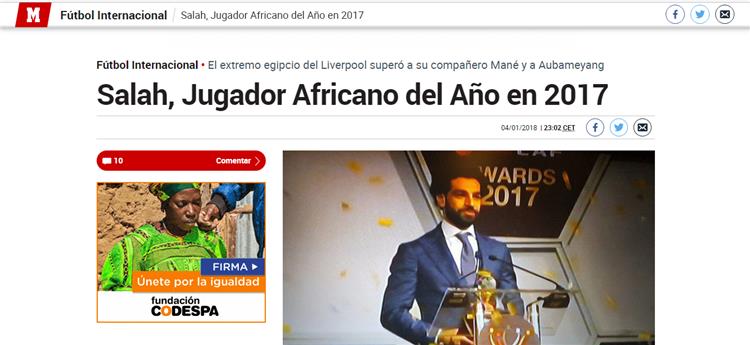 "لاعب ليفربول، المصري محمد صلاح، الذي شارك إلى حد كبير في تأهل بلاده لكأس العالم 2018، توج بأفضل لاعب أفريقي عام 2017، حيث كان يتنافس مع زميله ساديو ماني وبيير امريك أوباميانج".