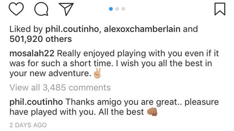 وكان صلاح قد نشر صور تجمعه بكوتينيو وعلّق عليها: "استمتعت حقًا باللعب معك حتى لو كان لوقتِ قصير، أتمنى لك كل التوفيق في مغامرتك الجديدة"، وجاء رد البرازيلي: "شكرًا صديقي، أنت عظيم، سعيد أنني لعبت معك، أتمنى لك كل التوفيق".