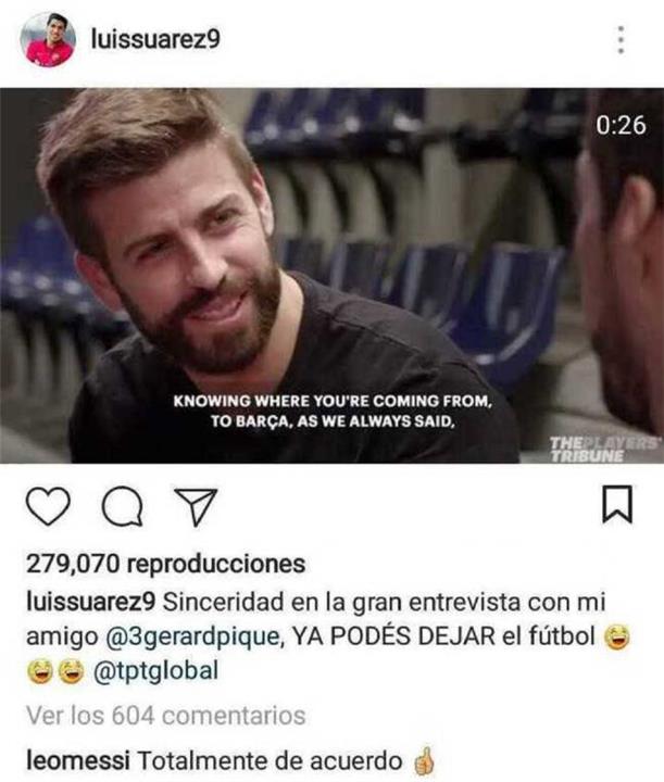 ونشر سواريز مقطع فيديو من المقابلة عبر حسابه الرسمي على موقع التواصل الاجتماعي "إنستجرام"، وعلّق عليه ممازحًا بيكيه: "المصداقية في المقابلة مع صديقي جيرارد بيكيه، الآن يمكنك اعتزال كرة القدم".